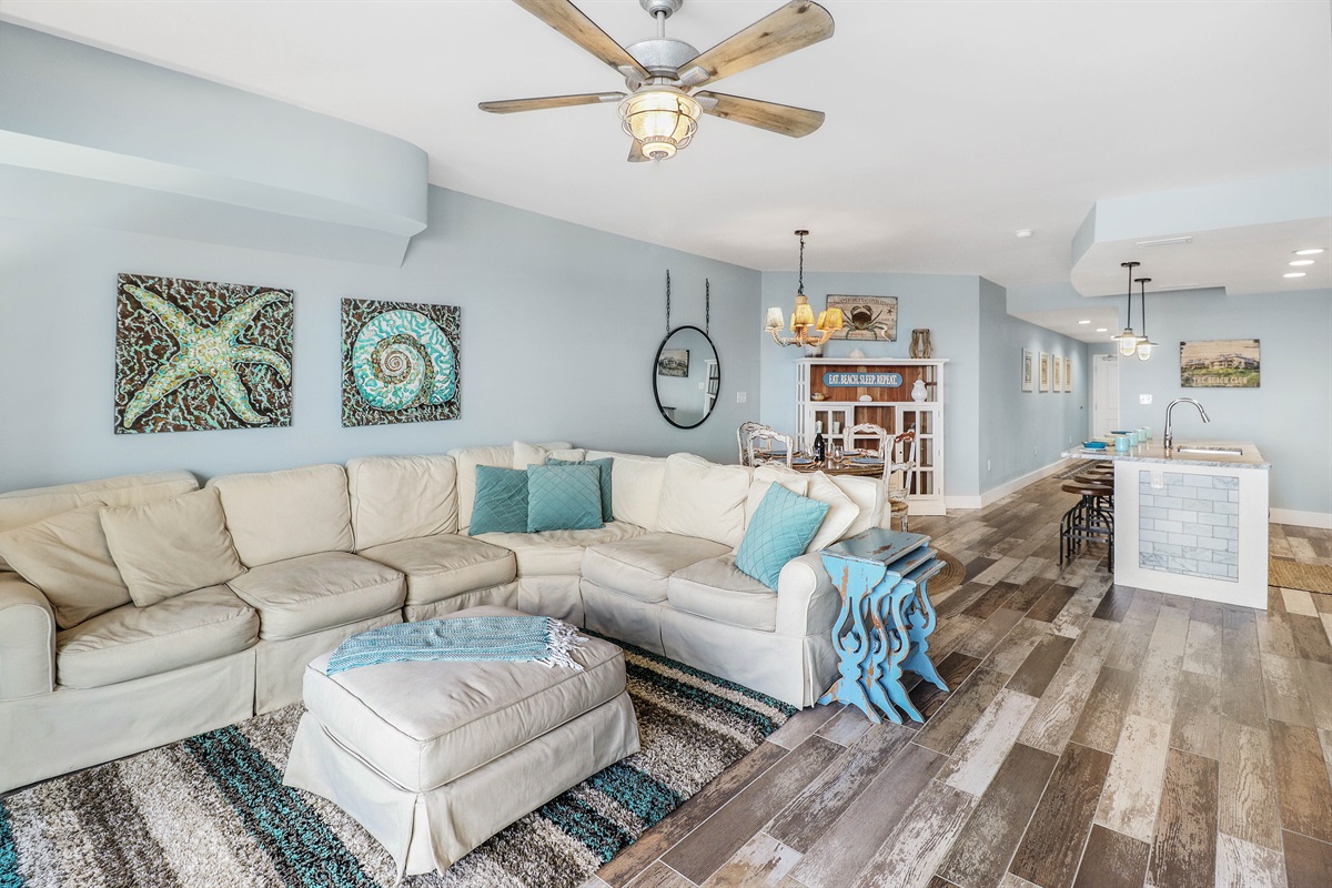 As you step inside, you are immediately struck by the beautiful and comfortable furniture and decor that enhance the charm and comfort of the unit. The spacious living room features a large sectional sofa and a large flat-screen TV for your entertainment. You'll be surrounded by gorgeous touches like coastal artwork, stylish lighting, and high-quality furnishings.